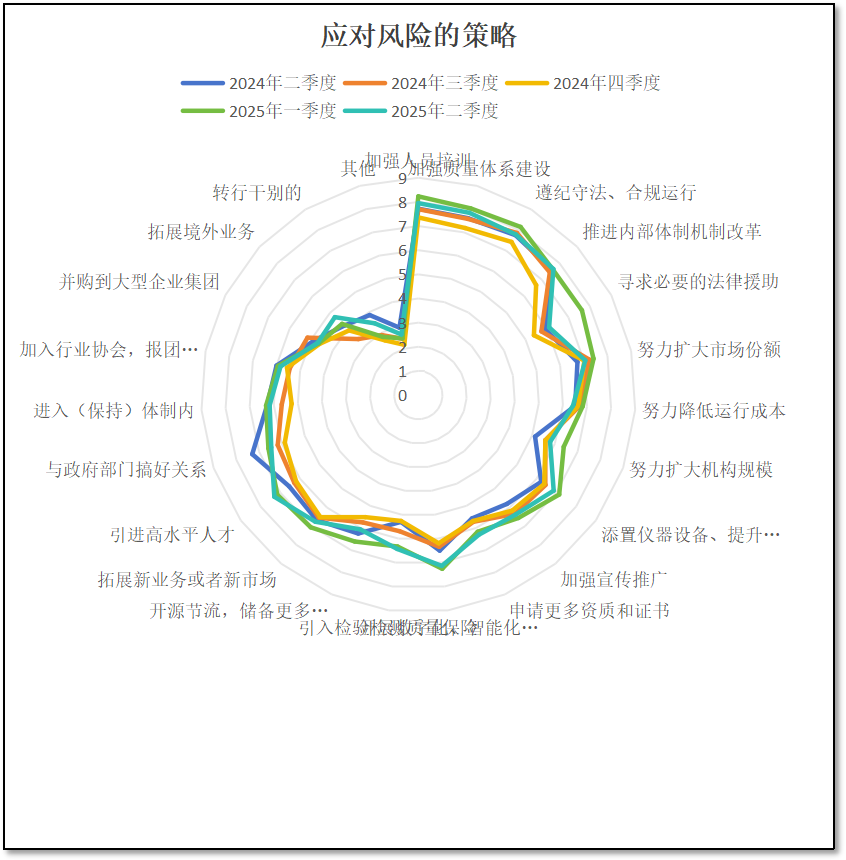 对于“市场经营”方面风险来说,分值从2024年二季度最初的3.87分提高到三季度的5.91分后,去年四季度末进一步提高到5.93分,但2025年一季度下降到4.11分,重归“低风险”区间,二季度进一步降低到3.98,分值已经低于体制机制、质量管理等其他几个风险事项,不再是从业者们认为风险最高的题,这从一个侧面也说明近期检验检测市场发展态势转好。