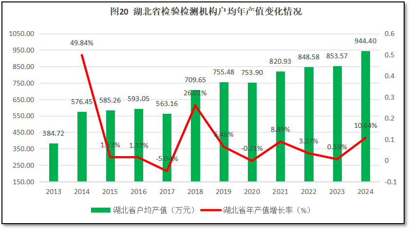 由图20可见,总体来看,湖北省检验检测机构户均年产值持续保持增长,仅在2017年和2020年出现过两次轻微下跌。2024年湖北省检验检测机构户均年产值为944.4万元,是2013年的2.45倍。从增长率的曲线来看,除了头两年数据误差大显得增长率很高之外,湖北省在2018年出现一次比较显著的增长率高峰,增幅达到26.01%,其余年份增幅不大,2024年度的增幅是最近五六年来最高的一次,达到10.64%。