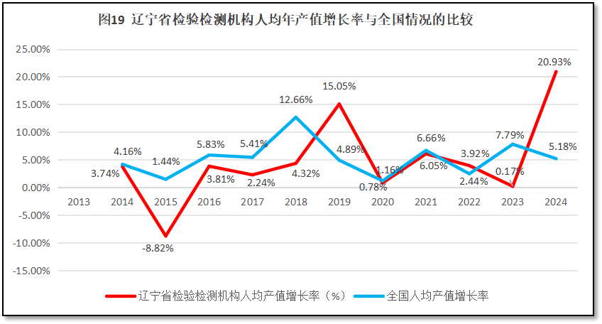 再来看辽宁省检验检测机构人均年产值增长率与全国人均年产值增长率的比较,如图19所示。